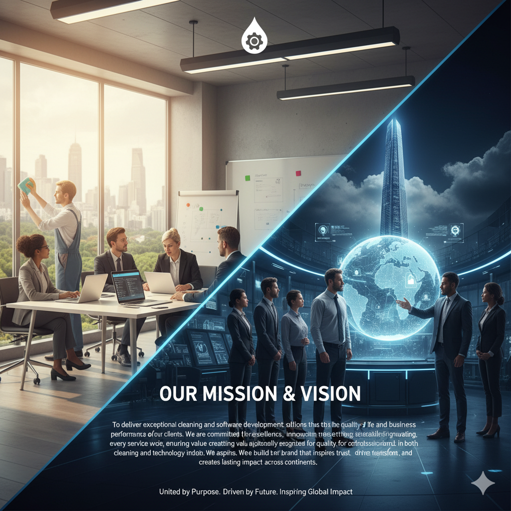 To be a globally recognized leader in integrated service solutions , setting the standard for quality, innovation, and professionalism in both the cleaning and technology industries. We aspire to build a brand that inspires trust, drives transformation, and creates lasting impact across continents.